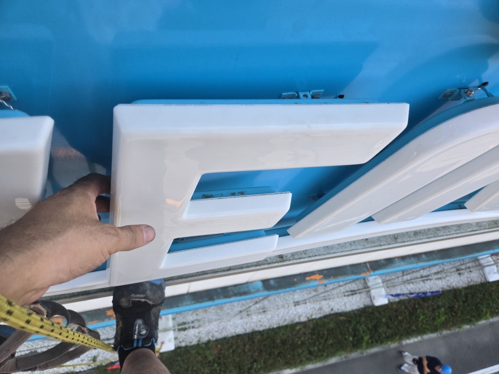 横浜市にて、壁面文字の補修の依頼があり、対応してきました。原因は暑さにより、白アクリル板の粘着が溶け 落下する現象が起きているとの事でした。すぐに現場に向かい補修をしに行きました。
