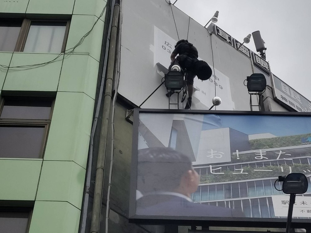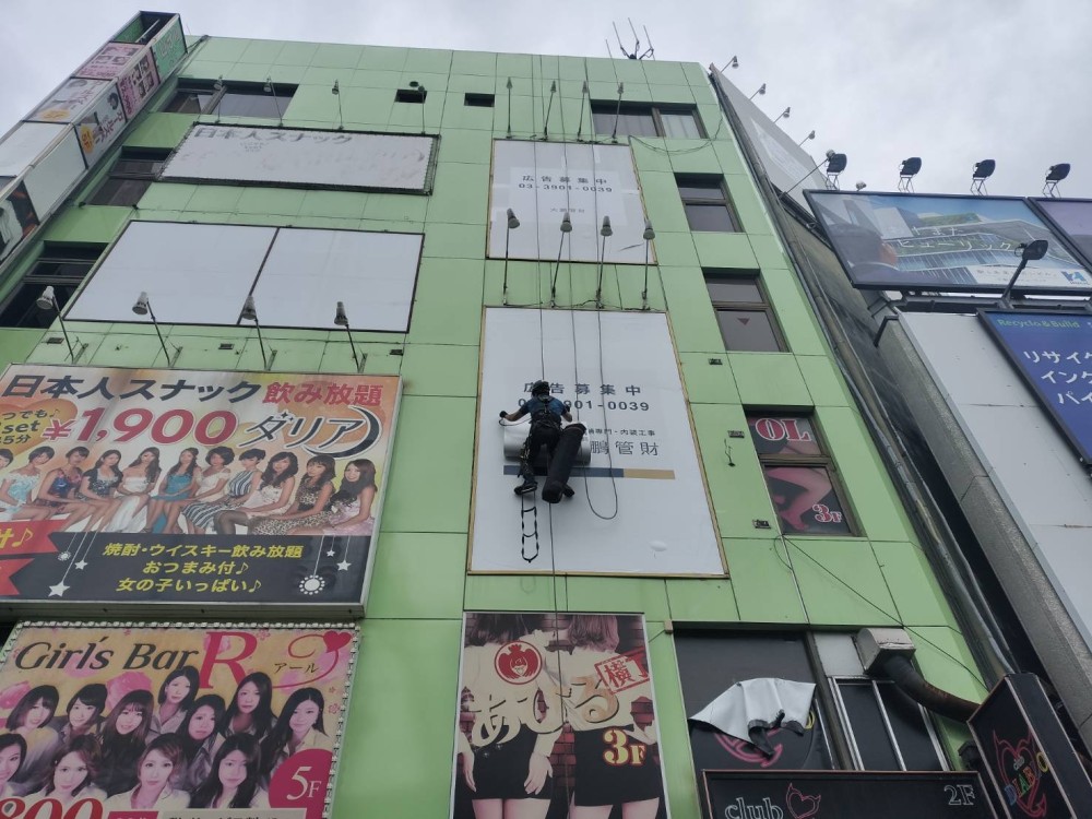 本日は2名のロープアクセス施工者で W2000×H1000×3か所に広告募集シート貼りを行います。こちらは壁面看板です。