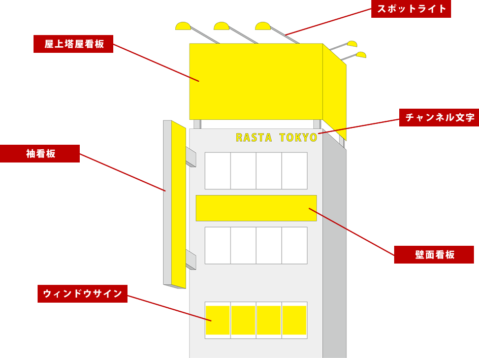 インクジェットシート貼り/カッティング貼り/白戻し/シート剥し/アルミ複合板の取付/アクリル板の交換/チャンネル文字の取付、撤去 /照明の取付/LED化工事/蛍光灯交換/電球交換/各種電気工事/安全点検/現地調査/各種メンテナンス/原状回復工事/塗装工事/各種看板設置工事/各種看板撤去工事/各種看板改修工事