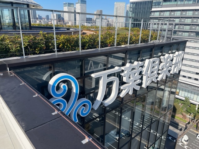 はじめて豊洲市場に来ました!!本日はこちらのチャンネル文字表示面アクリル板交換をロープアクセス施工で行います。よろしくお願いいたします。