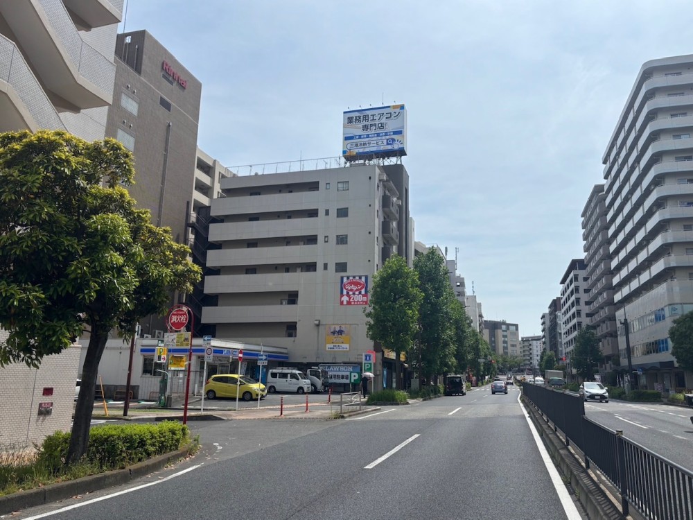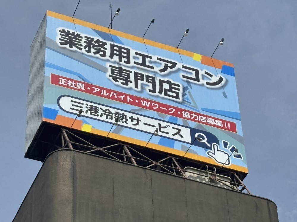 本日は横浜市神奈川区に来ております。国道1号線沿いにある塔屋看板にインクジェットシート上貼り施工を行いました。こちらは完成写真になります。W6000×H8000×2面=96㎡になります。