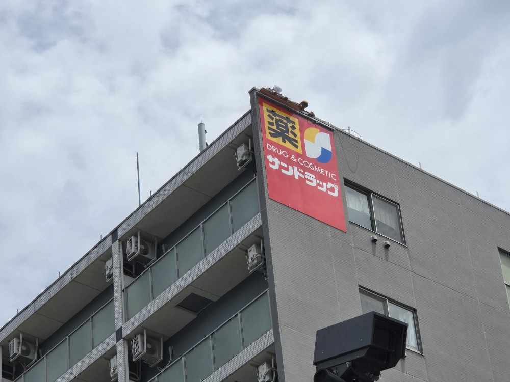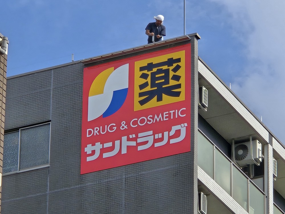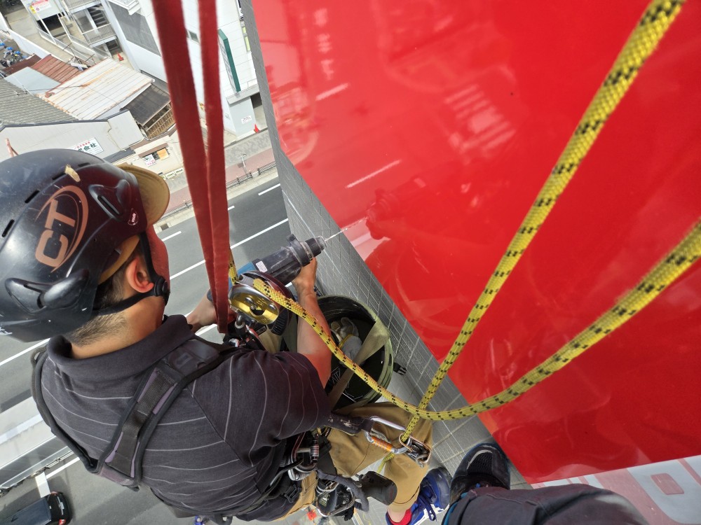 今回は大阪市の今里エリアに遠征です。マンションの9階にある壁面看板が劣化してきたので、新しくリニューアルします。アルミ複合板プレート看板の設置写真になります。真下にはガードマンを1名配備しカラーコーンで囲わせていただいていおります。安全第一です。