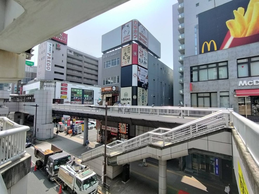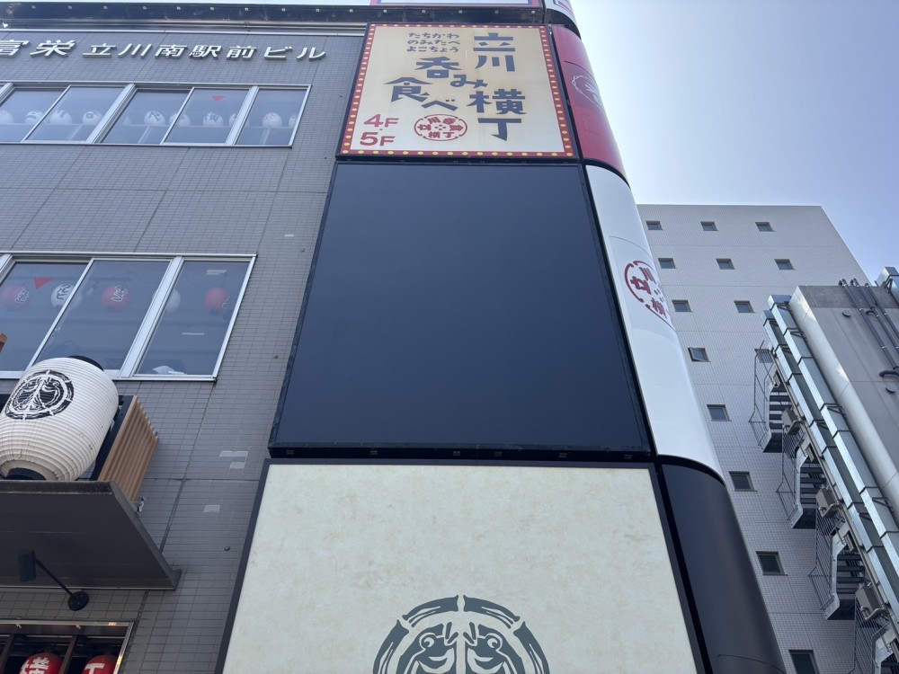 本日は立川駅目の前です。歩道橋沿いの壁面看板(FFシート)に、黒のカッティングシート貼りをし、目隠し施工の内容をロープアクセスで行います。ではスタートです!!