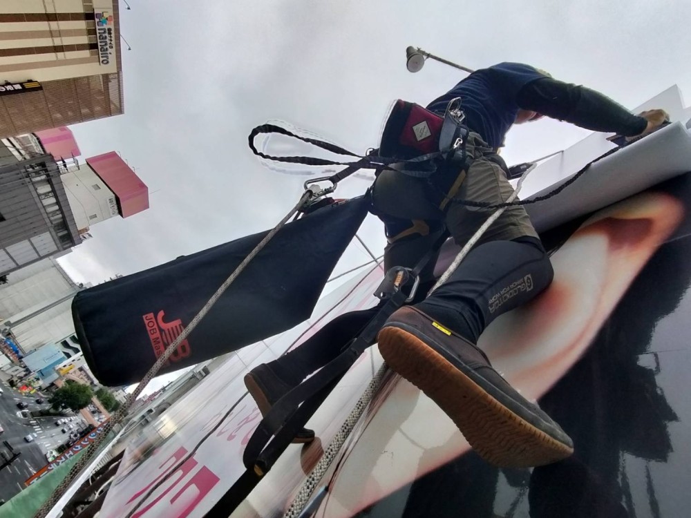 施工時間は1日で完成します。事前にインクジェットシートの分割を施工しやすいように分けて、完成度を高く、スピーディーに施工する為の工夫をシートに施して来ました。事前の準備段階とロープアクセス施工技術の融合で、遠征先での失敗は無いようにしています。