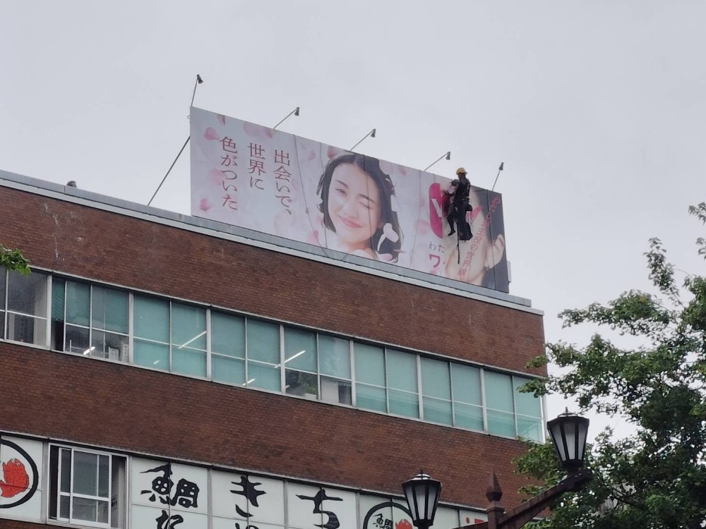 久しぶりに仙台に来ました。今回は仙台の繁華街で、屋上看板にインクジェットシート上貼り施工のミッションです。1泊2日2名で来ました。