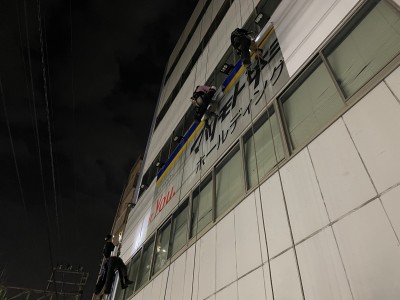 2023年10月23日松戸駅前にて塔屋看板原状回復白シート上貼り施工